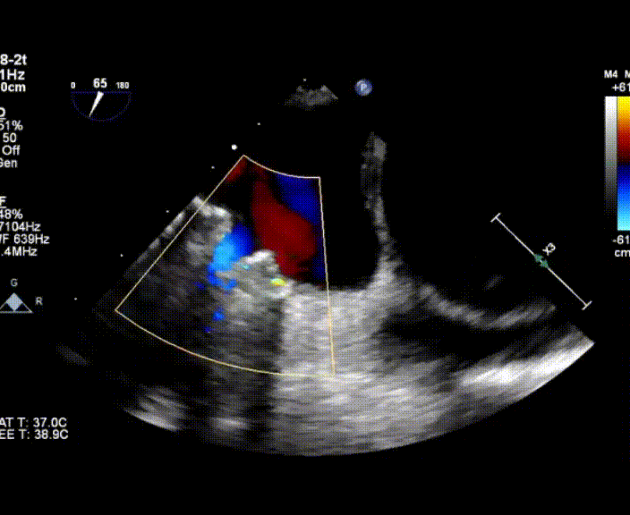 術中首先在局麻下穿刺股動脈、股靜脈,完成心導管檢查評估后轉為全麻,在食道超聲引導下穿刺房間隔,穿刺成功后將加硬導絲送入左上肺靜脈建立軌道,根據(jù)患者病情行球囊預擴張后植入6mm孔徑房間隔造孔支架,經(jīng)透視及食道超聲評估支架左右盤展開良好,夾持于房間隔兩側,固定穩(wěn)定、位置良好,食道彩超顯示房水平右向左為主分流,分流孔直徑符合預期大小,心導管檢查評估達到預期效果,釋放造孔支架。術后12h患者下床活動,恢復順利,擬于近日完善術后評估后出院。