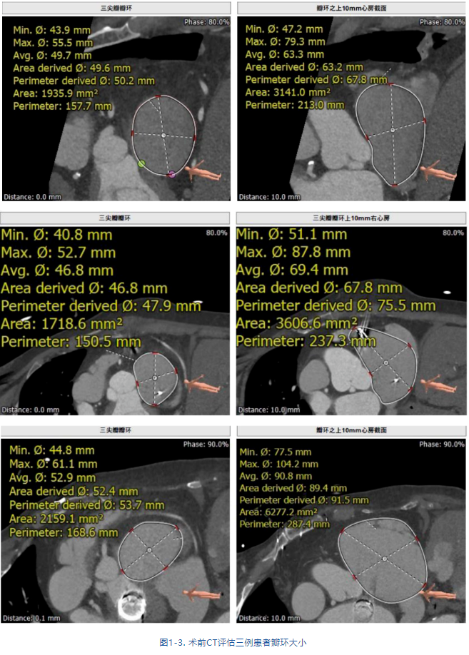 接受治療的是三例重度三尖瓣反流患者,術(shù)前基礎(chǔ)疾病多,均患有嚴重心律失常,其中兩例患者NYHA心功能Ⅱ/Ⅲ級。結(jié)合術(shù)前CT評估結(jié)果,三例患者的自體瓣環(huán)都較大(圖1-3),最大者平均瓣環(huán)為53.7mm;有一例患者有起搏器植入史,術(shù)中操作有纏繞起搏器導(dǎo)線的風(fēng)險;三例患者入路血管均無嚴重迂曲和鈣化。經(jīng)術(shù)前討論分析,潘湘斌教授及其團隊潘家華教授、朱達教授、王首正教授以及心超室的駱志玲教授,董念國教授及其團隊謝明星教授、尚小珂教授、陳澍教授、鐘禹成教授經(jīng)過討論決定,采用創(chuàng)新的 LuX-Valve Plus經(jīng)血管三尖瓣置換系統(tǒng)對患者進行手術(shù)。LuX-Valve Plus是我國自主研發(fā)的經(jīng)血管介入三尖瓣置換系統(tǒng),經(jīng)頸靜脈入路的微創(chuàng)方式可進一步降低對患者的創(chuàng)傷。