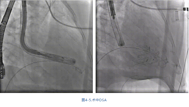 手術(shù)在全麻狀態(tài)下進行,采用經(jīng)右側(cè)頸靜脈入路,在TEE和DSA的指引下緩慢送入輸送器進入體內(nèi),進入右室后釋放室間隔錨定裝置,旋轉(zhuǎn)輸送器,使得錨定裝置對準室間隔面;釋放前瓣夾持件,確定夾持件位于右室側(cè)后釋放人工瓣膜盤片,DSA及超聲確認盤片位于右房側(cè),并適時調(diào)整瓣膜的同軸性。在DSA和超聲的監(jiān)視下調(diào)整室間隔錨定件貼合室間隔,釋放室間隔錨定裝置。再次確認瓣膜的穩(wěn)定性和同軸性后,將輸送器撤出體內(nèi),最終完成瓣膜植入(圖4-5),手術(shù)室即刻拔除氣管插管。術(shù)后超聲提示人工三尖瓣同軸性良好,瓣架固定牢靠,無反流和瓣周漏,術(shù)后三尖瓣平均跨瓣壓差顯著降低。
