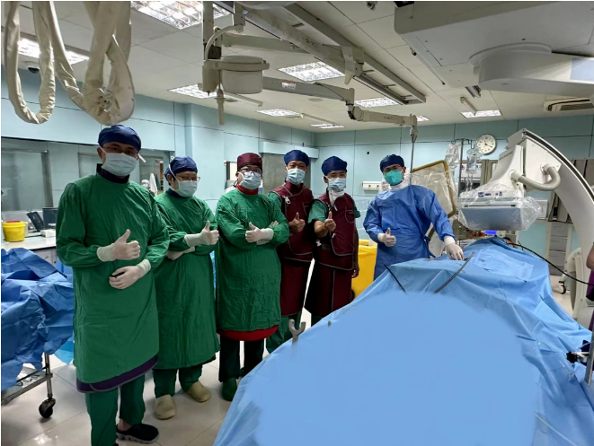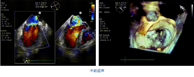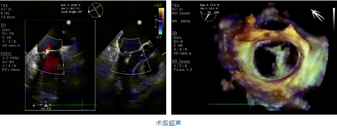 在阜外醫(yī)院潘湘斌教授團隊的支持下,手術(shù)經(jīng)股靜脈-房間隔入路,采用全身麻醉插管,在TEE和DSA引導(dǎo)下完成房間隔穿刺。置入JensClip瓣膜夾系統(tǒng)后,在左房調(diào)整瓣膜夾的位置和軸向,后進(jìn)入左室,在TEE引導(dǎo)下捕捉二尖瓣前后瓣葉,并關(guān)閉瓣膜夾。經(jīng)TEE反復(fù)確認(rèn)手術(shù)效果后最終鎖定并釋放瓣膜夾。術(shù)后即刻超聲顯示瓣膜夾位置穩(wěn)定,功能良好,二尖瓣反流由術(shù)前4+減少至微量,手術(shù)圓滿成功。