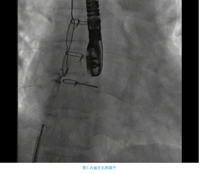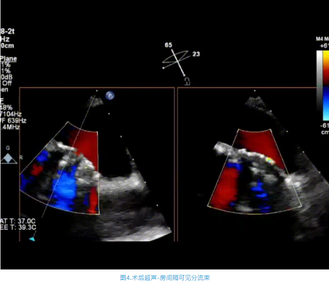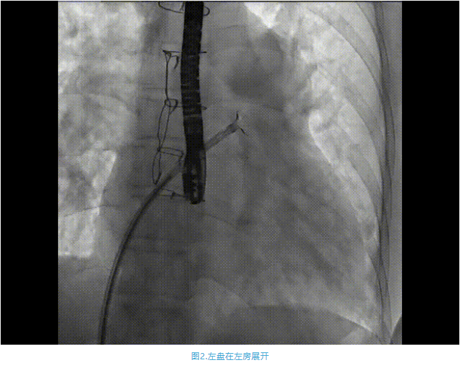 術(shù)中首先在局麻下穿刺股動(dòng)脈、股靜脈,完成心導(dǎo)管檢查評估后轉(zhuǎn)為全麻,在食道超聲引導(dǎo)下穿刺房間隔,穿刺成功后將加硬導(dǎo)絲送入左上肺靜脈建立軌道,根據(jù)患者病情行球囊預(yù)擴(kuò)張后植入6mm孔徑房間隔造孔支架,經(jīng)透視及食道超聲評估支架左右盤展開良好,夾持于房間隔兩側(cè),固定穩(wěn)定、位置良好,食道彩超顯示房水平右向左為主分流,分流孔直徑符合預(yù)期大小,心導(dǎo)管檢查評估達(dá)到預(yù)期效果,釋放造孔支架。術(shù)后12h患者下床活動(dòng),恢復(fù)順利,擬于近日完善術(shù)后評估后出院。