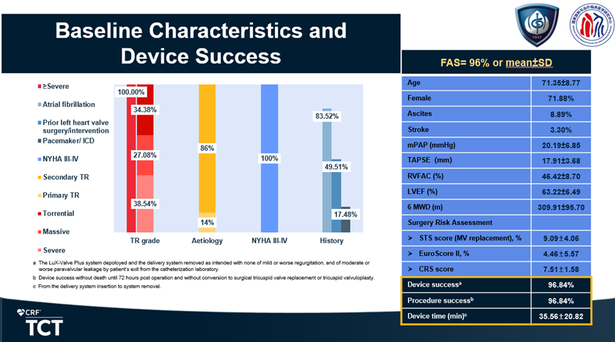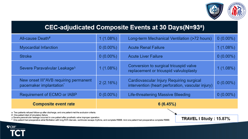 TRAVEL Ⅱ是一項前瞻性、多中心、單臂臨床試驗,主要用于評估LuX-Valve Plus在重度三尖瓣反流患者中應用的長期安全性和有效性。TRAVELⅡ臨床試驗已納入中國15家中心的96例患者,所發(fā)布的一個月臨床數(shù)據(jù)主要終點為手術后30天復合事件發(fā)生率。