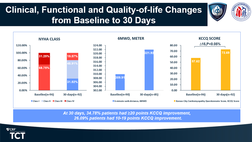 100%患者三尖瓣反流降低至輕度及以下,97.81%患者顯示無或僅微量瓣周漏 在美國紐約心臟協(xié)會(NYHA)心功能改善和生活質(zhì)量評分方面,80.43%患者由術前NYHA Ⅲ/Ⅳ級提升至Ⅰ/Ⅱ級,34.78%患者KCCQ評分提升≥20分,26.09%患者提升10~19分