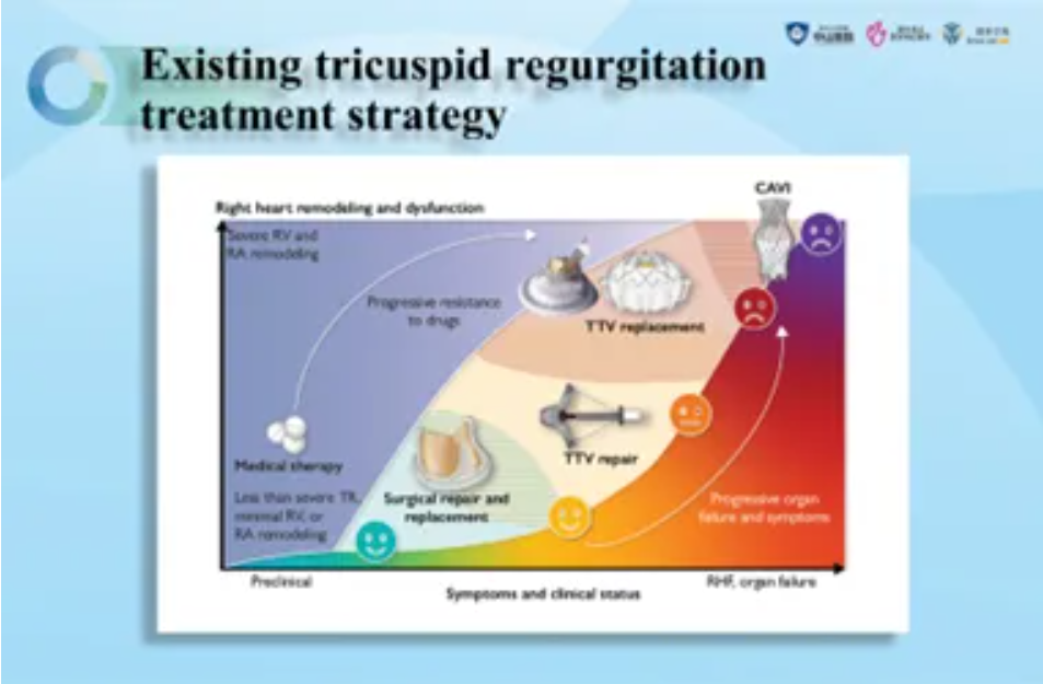 長(zhǎng)久以來,隨著學(xué)術(shù)領(lǐng)域?qū)τ谌獍攴盗髡J(rèn)知的加深,從解剖學(xué)到影像學(xué),從傳統(tǒng)藥物治療到外科手術(shù)治療,針對(duì)三尖瓣返流的微創(chuàng)介入技術(shù)一直是學(xué)界關(guān)注的熱點(diǎn)話題之一。結(jié)合三尖瓣返流所并發(fā)的右心系統(tǒng)結(jié)構(gòu)改變,魏來教授首先闡述了現(xiàn)有介入手術(shù)器械在不同解剖條件及不同疾病發(fā)展進(jìn)程中所面臨的挑戰(zhàn)。作為現(xiàn)有的三尖瓣返流介入治療方案,三尖瓣TEER療法往往受限于三尖瓣返流所帶來的特殊解剖變異,如瓣環(huán)擴(kuò)張、瓣葉裂隙過大等。