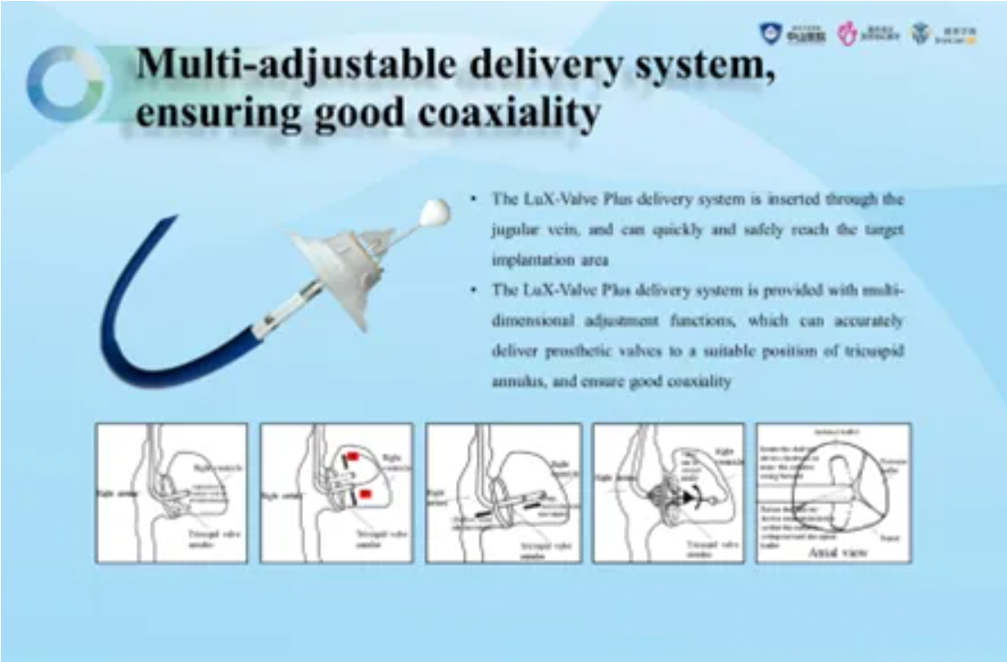 2022年,隨著復(fù)旦大學(xué)附屬中山醫(yī)院的葛均波院士牽頭完成FIM研究并將結(jié)果發(fā)表于國際頂級(jí)期刊《Eurointervention》,LuX-Valve Plus獲得國內(nèi)外的廣泛關(guān)注。有別于傳統(tǒng)經(jīng)股靜脈入路三尖瓣介入手術(shù)器械,LuX-Valve Plus創(chuàng)新性采用經(jīng)頸靜脈作為手術(shù)主入路,可將人工瓣膜快速送達(dá)目標(biāo)手術(shù)區(qū)域,整體輸送行程較短,有效降低入路周邊解剖組織并發(fā)癥及術(shù)中出血風(fēng)險(xiǎn)。同時(shí),魏來教授表示,LuX-Valve Plus輸送系統(tǒng)所具有的聯(lián)動(dòng)調(diào)彎功能,面對(duì)右心房較小的患者,可在進(jìn)入右心房后快速進(jìn)行調(diào)彎遞送,從容調(diào)整,快速同軸,降低手術(shù)整體風(fēng)險(xiǎn)并安全進(jìn)行手術(shù)。