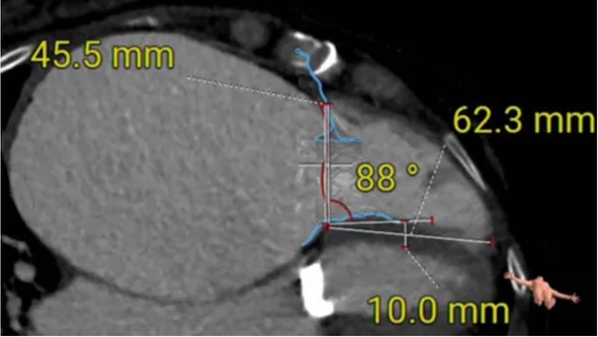 經(jīng)過術(shù)前討論,患者為重度三尖瓣返流,基礎(chǔ)情況差,外科高危風(fēng)險(xiǎn),右心房容積明顯增大,三尖瓣瓣環(huán)顯著擴(kuò)張,經(jīng)術(shù)前CT測(cè)量,三尖瓣瓣環(huán)最大徑53.9mm,周長(zhǎng)平均徑49mm,推薦經(jīng)頸靜脈行三尖瓣置換術(shù),推薦使用JS/TTVI-30-55瓣膜。