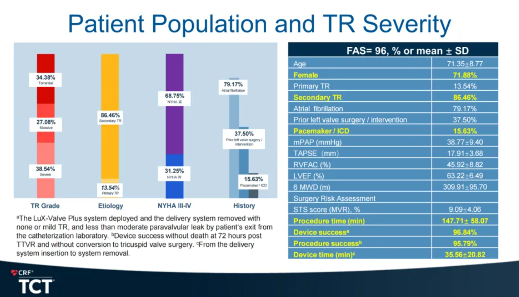 TRAVEL II研究主要用于評估LuX-Valve Plus在重度三尖瓣反流患者中應(yīng)用的長期安全性和有效性。TRAVEL II臨床試驗(yàn)共納入了中國15家臨床中心的96例患者?;颊咂骄挲g為71.35歲,平均STS評分為9.09%,37.50%的患者在研究前接受了左心瓣膜手術(shù),15.63%的患者存在起搏器植入史,同時多合并其他基礎(chǔ)病,基線情況較差,存在較高的外科手術(shù)風(fēng)險和接受其他介入治療方式的難度。