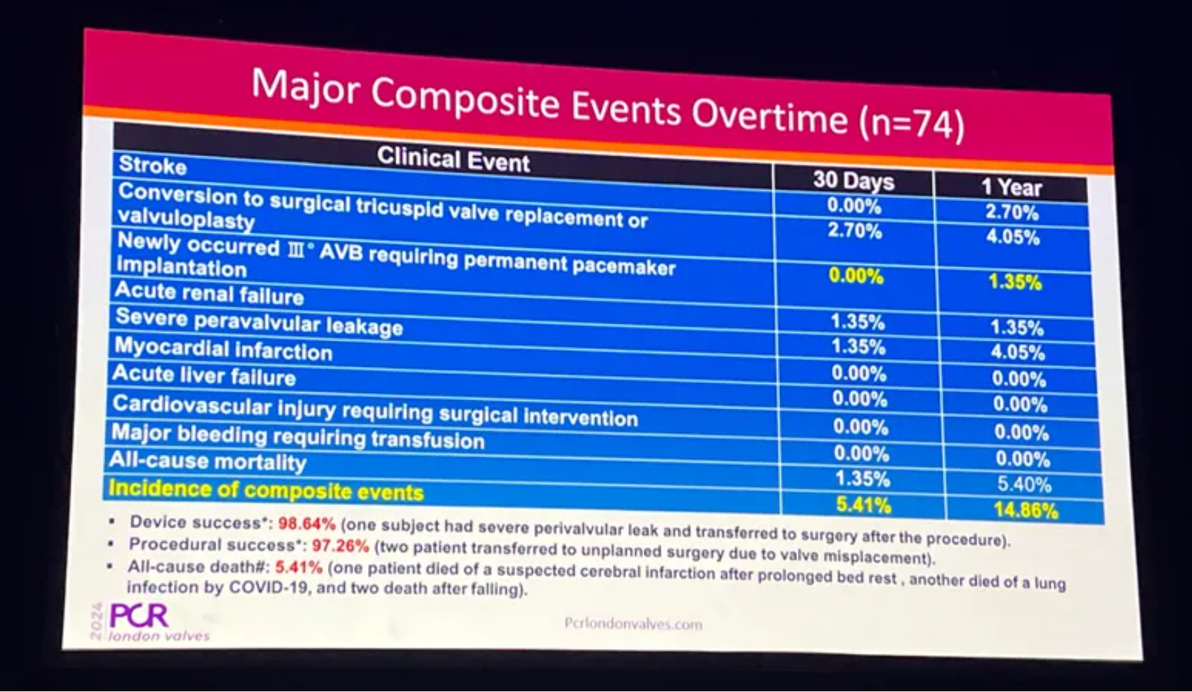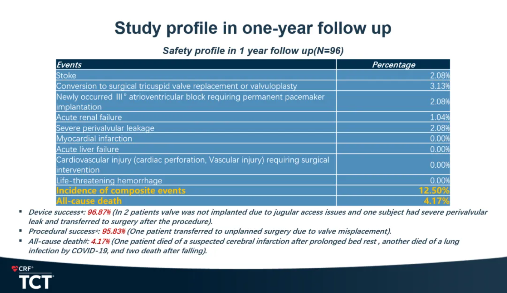 安全性結(jié)果顯示,復(fù)合事件發(fā)生率為12.50%,依然維持在較低水平。心梗、使用ECMO(體外膜肺氧合)或IABP(主動脈內(nèi)球囊反搏)、急性肝功能衰竭、長期機(jī)械通氣(>72小時)、需要外科干預(yù)的心血管損傷(心臟穿孔、血管損傷)、危及生命的大出血事件發(fā)生率均為0%。全因死亡率僅為4.17%,急性腎臟衰竭、重度瓣周漏和中轉(zhuǎn)外科三尖瓣置換或成形術(shù)發(fā)生率分別為1.04%、2.08%和3.13%。新發(fā)III度房室傳導(dǎo)阻滯需植入永久心臟起搏器的發(fā)生率僅2.08%。