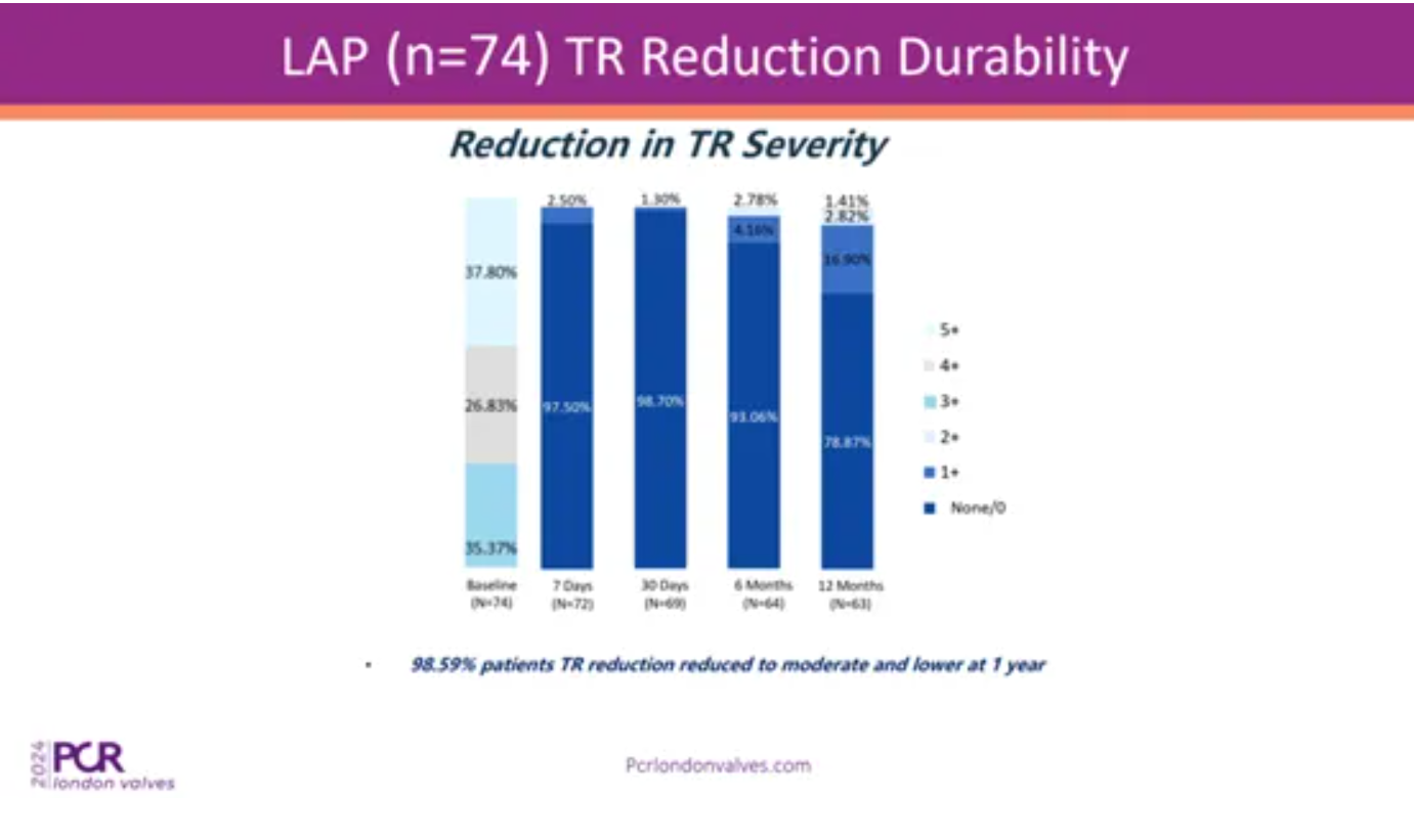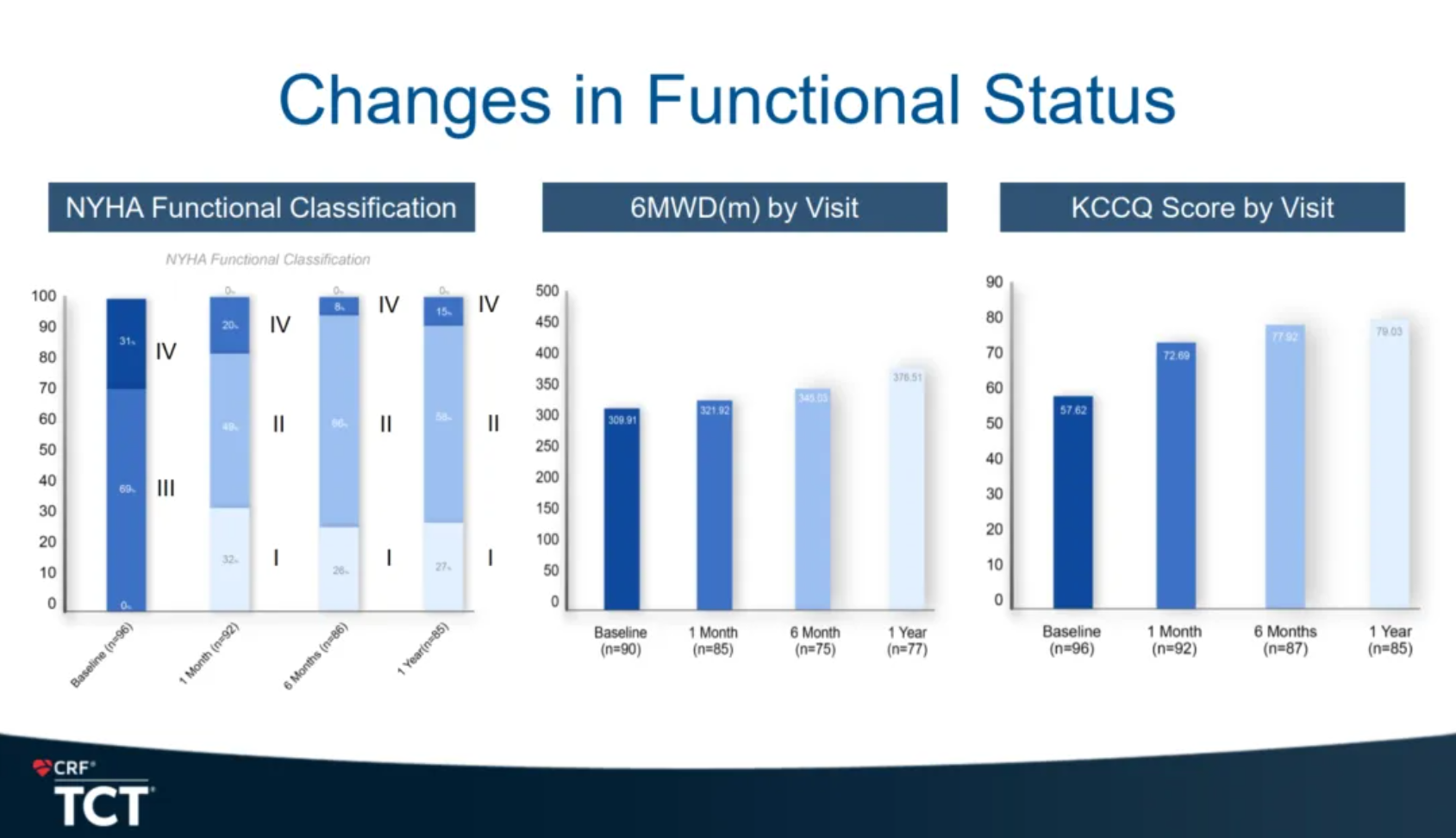 有效性結(jié)果顯示,患者的反流等級、心功能等級,以及生活質(zhì)量顯著改善。95.30%的患者在一年期時顯示無中度及以上反流。同時,根據(jù)超聲數(shù)據(jù)顯示,患者右心系統(tǒng)重構(gòu)也獲得受益。