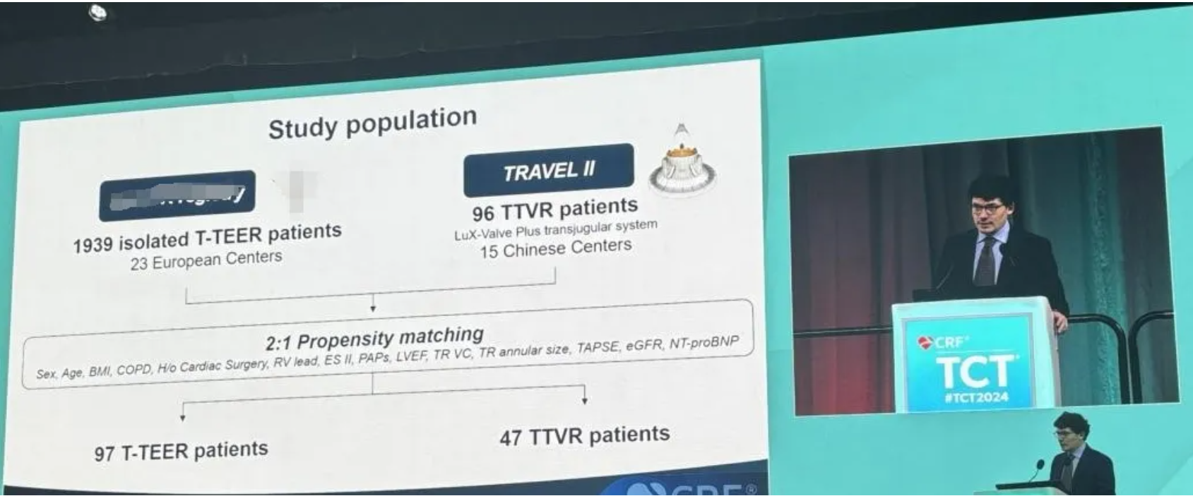 此外,來自美國心血管研究基金會(Cardiovascular Research Foundation, New York, U.S.)的Guido Ascione博士進(jìn)行了一項(xiàng)有癥狀的三尖瓣反流高?;颊逿-TEER與TTVR的一年臨床結(jié)果的傾向評分匹配分析。研究和分析中發(fā)現(xiàn),在以LuX-Valve Plus TRAVEL II一年期隨訪數(shù)據(jù)作為TTVR數(shù)據(jù)的引用的背景下,TTVR相對于T-TEER在三尖瓣反流問題解決層面有著更高的術(shù)式成功率,且一年后的臨床結(jié)果和功能評分中,置換和緣對緣相比并無統(tǒng)計(jì)學(xué)差異。