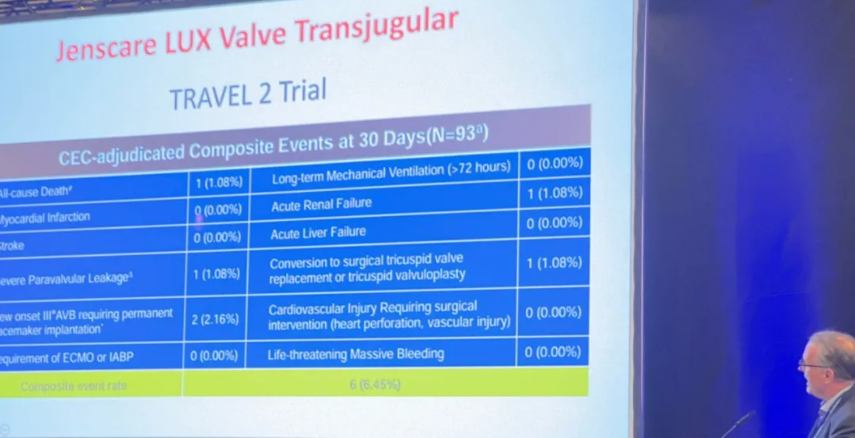 據(jù)這位教授介紹,作為國際創(chuàng)新的三尖瓣反流介入治療器械,LuX-Valve Plus已在歐洲全面開展以獲取CE Mark為目標(biāo)的臨床試驗(yàn)。他欣喜表示,LuX-Valve Plus的安全性及有效性正在逐步得到驗(yàn)證,其30天全因死亡率僅有1.08%(n=93),且由于其非徑向支撐力的設(shè)計(jì),術(shù)后新發(fā)III度房室傳導(dǎo)阻滯概率僅為2.16%。同時,創(chuàng)新的經(jīng)頸靜脈入路展現(xiàn)了其獨(dú)特的優(yōu)勢。研究結(jié)果表明,術(shù)后30天內(nèi)無危及生命的大出血事件發(fā)生。