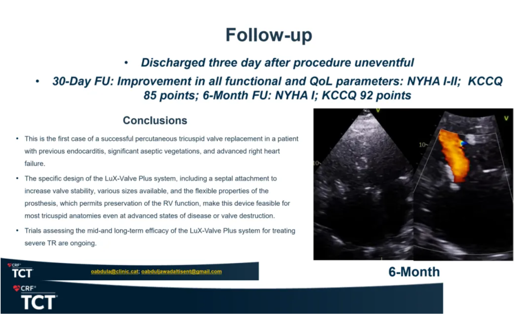 隨訪數(shù)據(jù)顯示,所有功能性和生活質(zhì)量指標(biāo)都有提升。30天數(shù)據(jù)顯示患者心功能從原來的NYHA III級回到I/II級,KCCQ評分提升37分;六個月期隨訪數(shù)據(jù)顯示心功能改善至NYHA I級,KCCQ評分提升42分。最后,這位術(shù)者總結(jié)道,這是一例成功用于患有心內(nèi)膜炎,嚴(yán)重?zé)o菌性贅生物以及晚期右心衰竭的患者的經(jīng)皮的三尖瓣置換手術(shù)。LuX-Valve Plus獨(dú)特的設(shè)計(jì),包括室間隔錨定,40-70mm可選的多樣型號,讓這款產(chǎn)品能應(yīng)對各種非常挑戰(zhàn)的三尖瓣解剖結(jié)構(gòu)。